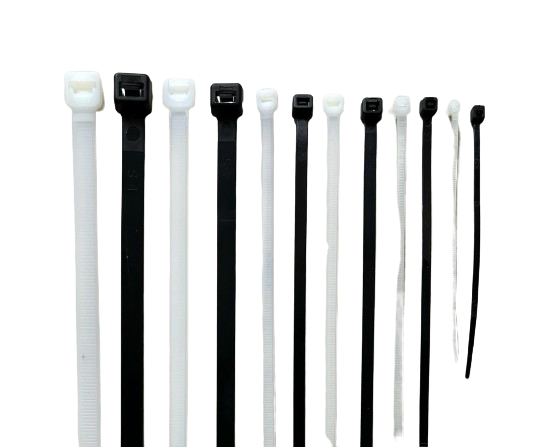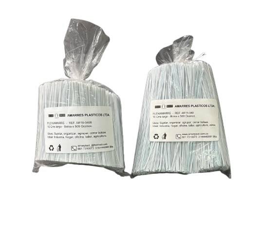 Fabricados en NYLON original, en colores blanco o negro, longitudes de 10, 15, 20, 25, 30, 35, 55 y 82 cms de largo, usados en el agrupamiento y sujeción de cables, mangueras, amarre de bolsas, sacos y otros, tanto en la industria, hogar, oficina, maquinaria, vehículos, etc.Su diseño permite un uso manual y fácil, tanto en interiores (color blanco transparente), como exteriores (color negro).